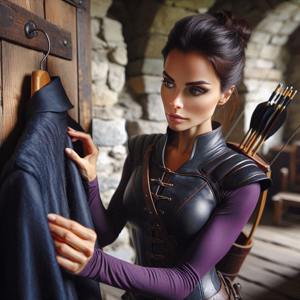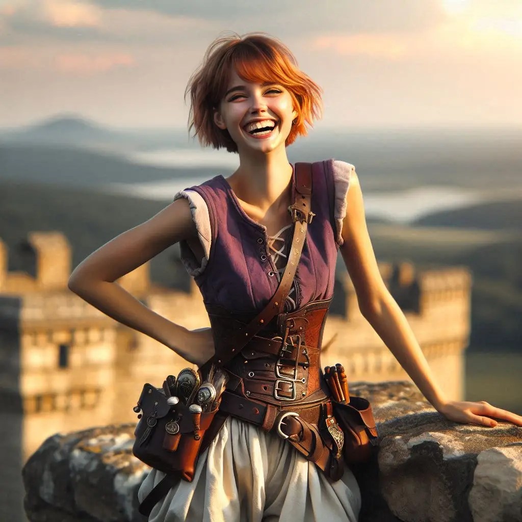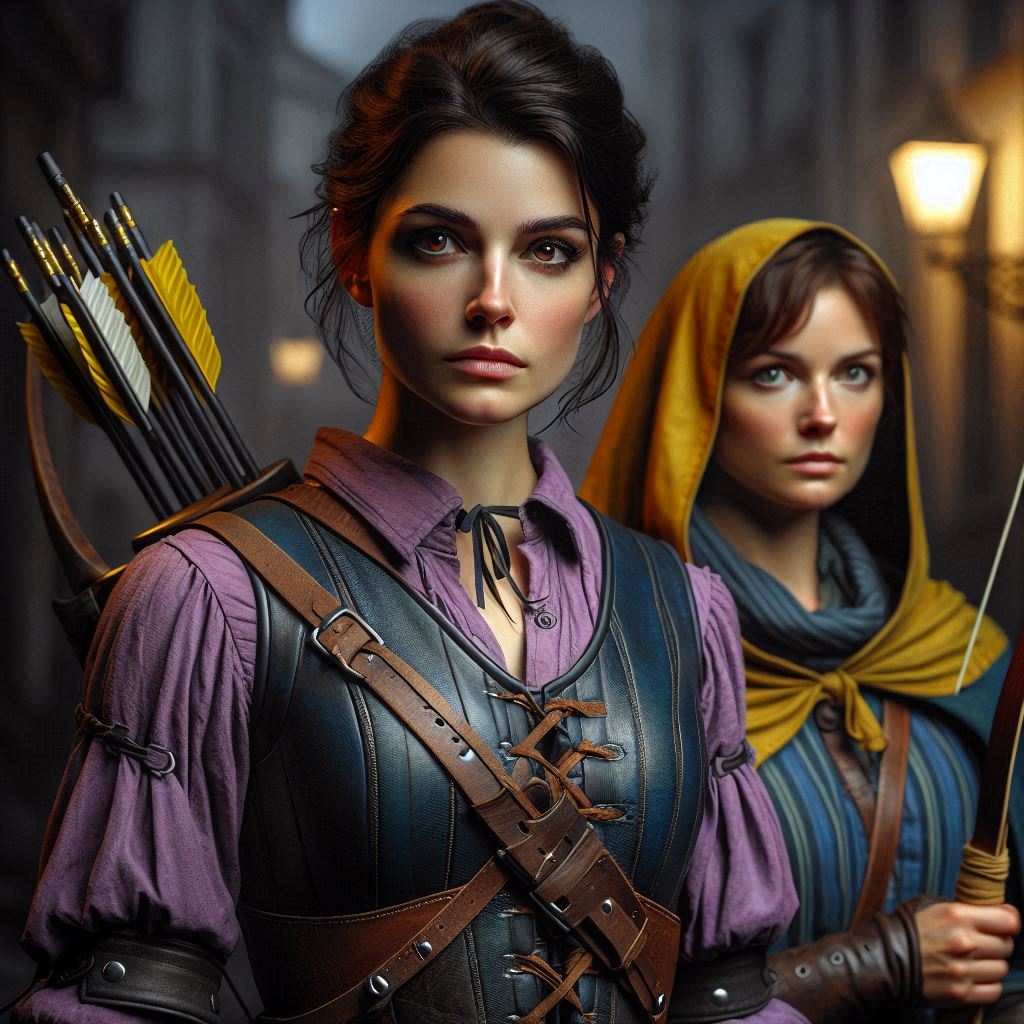 For Gabby there are two different AIs in use. The first of her sword training and her game portrait are OpenArt, the others are Co-Pilot/DallE. The treatment of the hair is notably different between the two. As is often true, I like the consistency and photo-realism of OpenArt, but I prefer the overall mood and vibrancy with Co-Pilot. It is funny how the two AIs understand “shoulder length hair” differently! And even the color. But they represent a couple years of time there, women do change their hair!