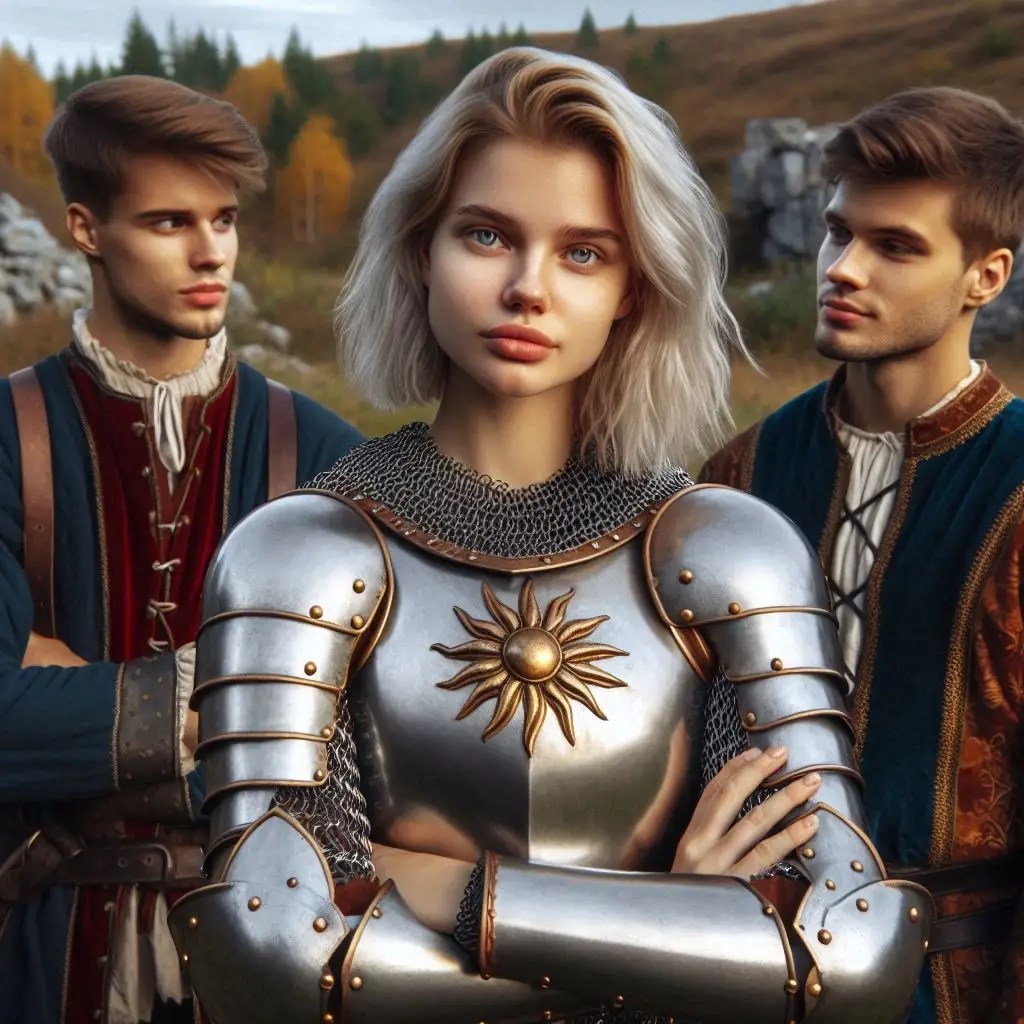 a young warrior woman (age 20, Slavic, fair skin, high cheekbones, short, cute, blue eyes, shoulder length light blonde hair).