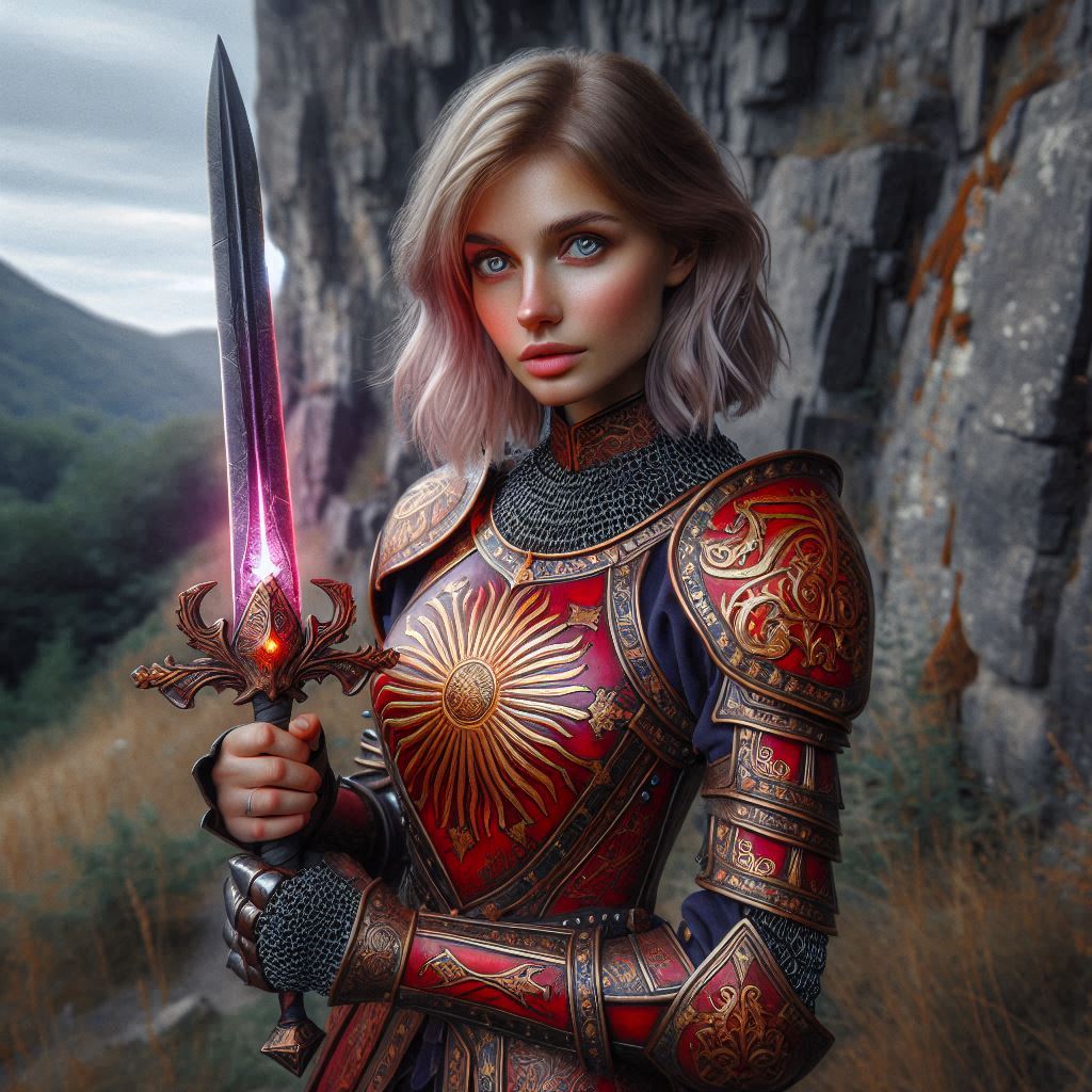 I still love those cool embossed armors. I’ve been using more of that on my enemies than on my main characters. I run with too many leather enthusiasts. Gabby’s sword is pretty neat too – especially the one with the purple highlights that she is holding in “Daero’s plate” showpiece. That looks very “fantasy artifact sword”.