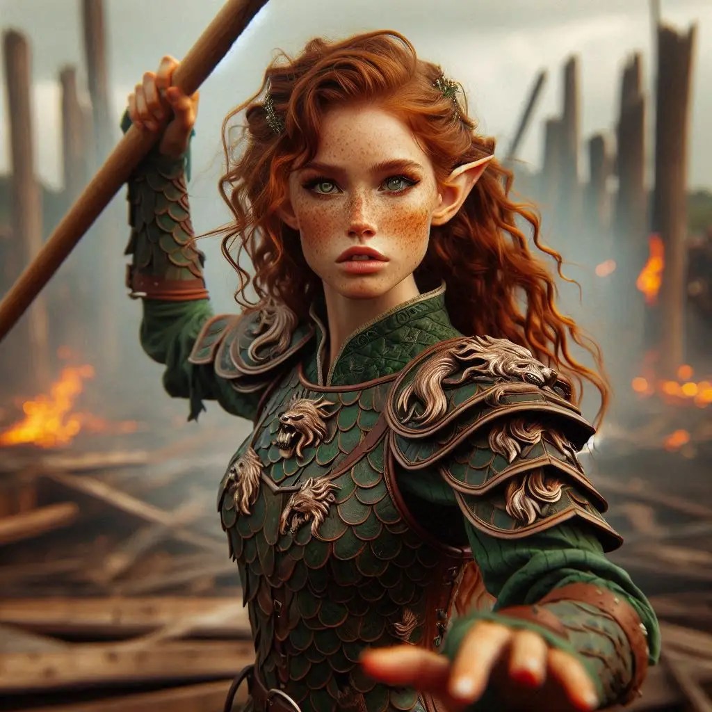 Then Erato went from “Blue leather armor with silver embroidered Lion Rampant motif” (the “celestial lion” is a symbol of Tymora) to the green dragon scale. I chose to render that as “green leather scale armor with silver lion rampant motif”.