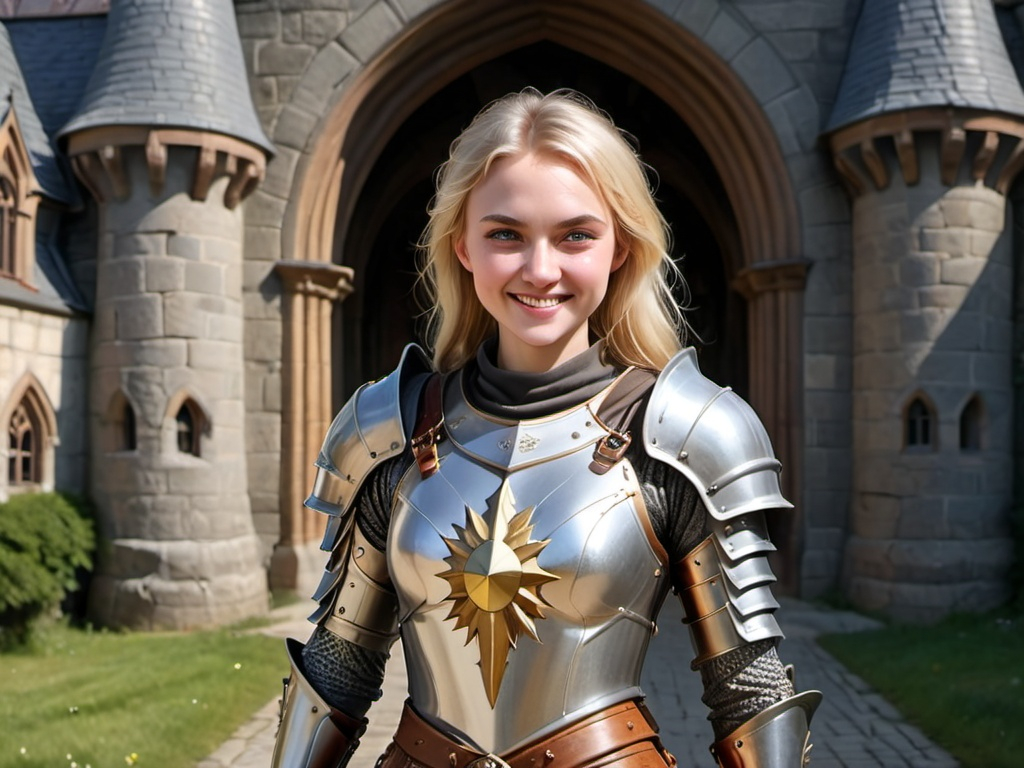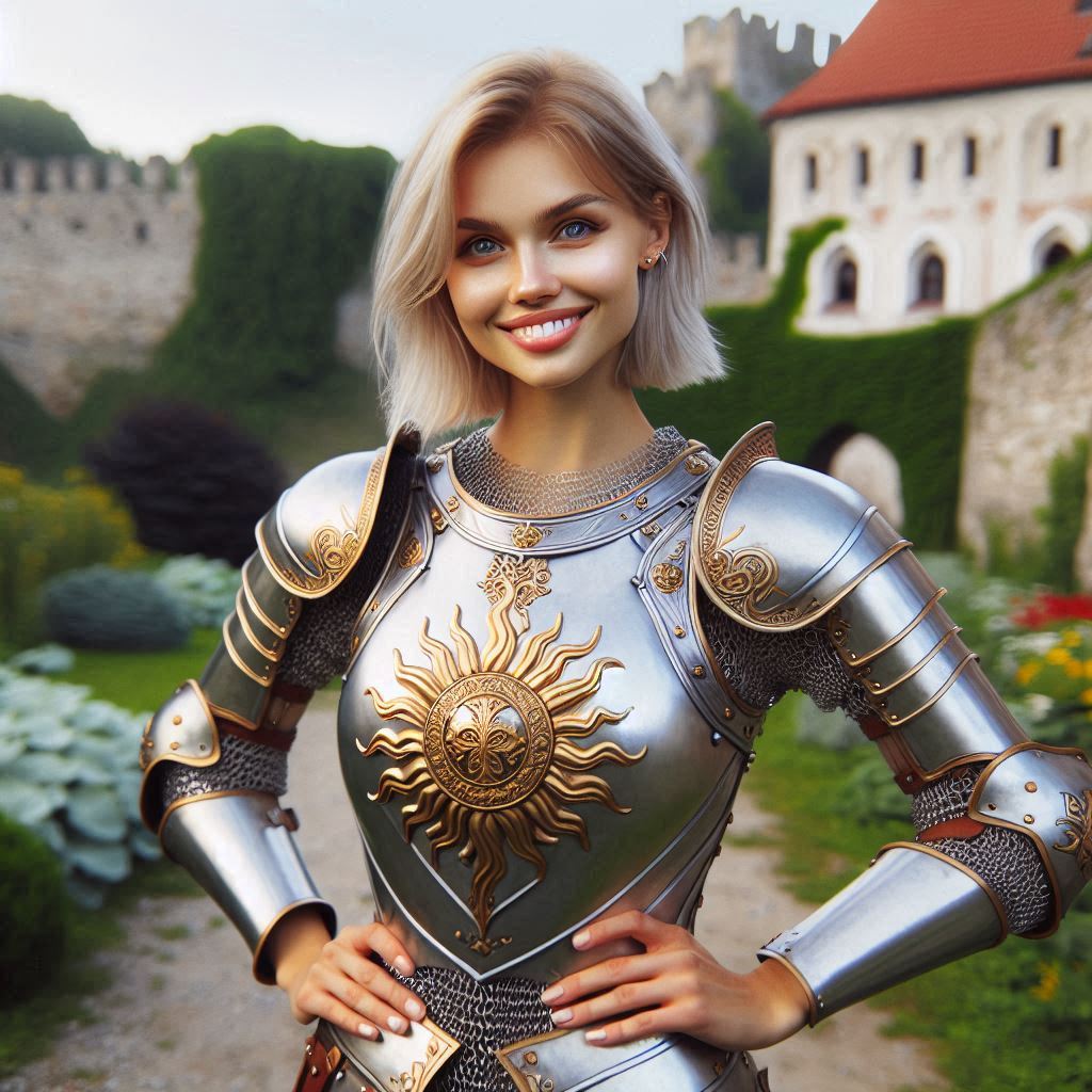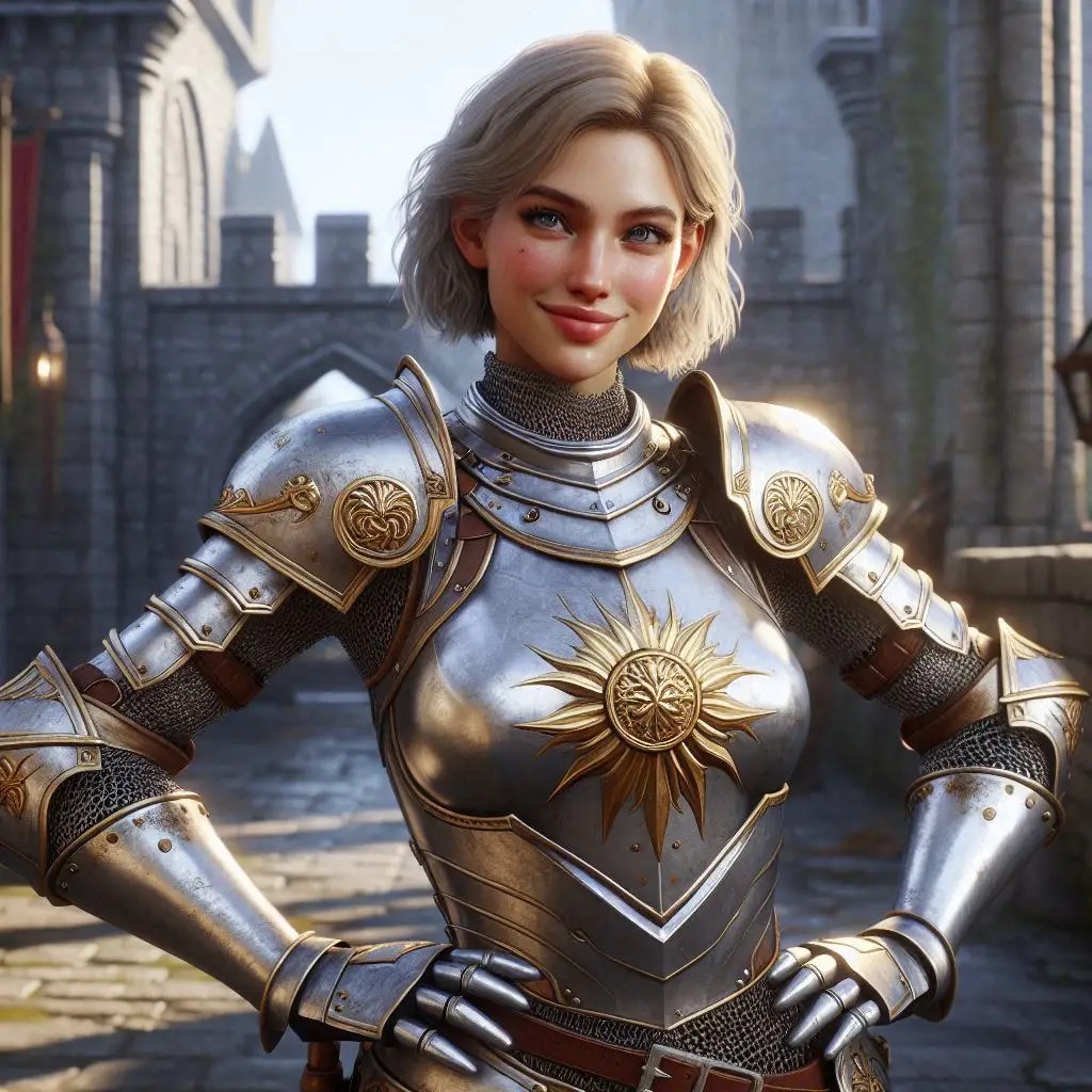 warrior woman (age 20, Slavic, fair skin, high cheekbones, short, cute, blue eyes, shoulder length pale blonde hair, wearing silver plate armor with gold sunburst motif) stands with hands on hips and smiles with raised eyebrow, Standing in a courtyard near a castle wall; realistic photo, medieval fantasy