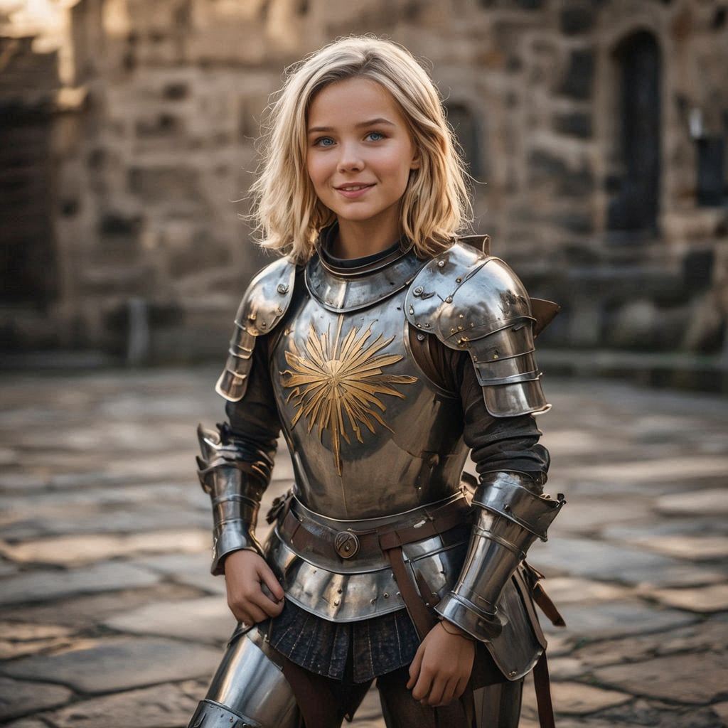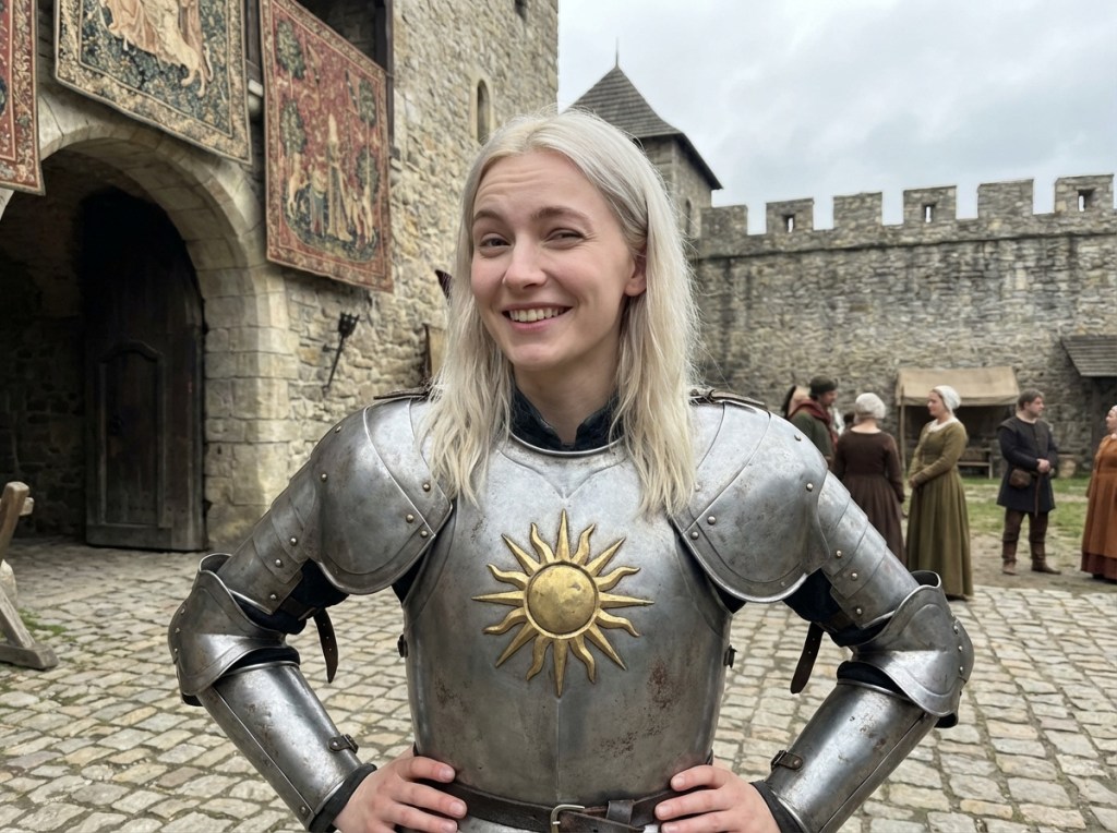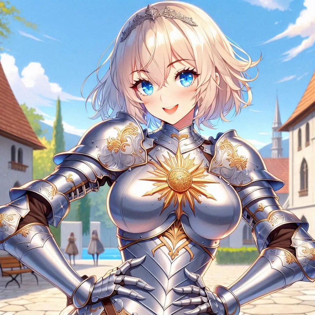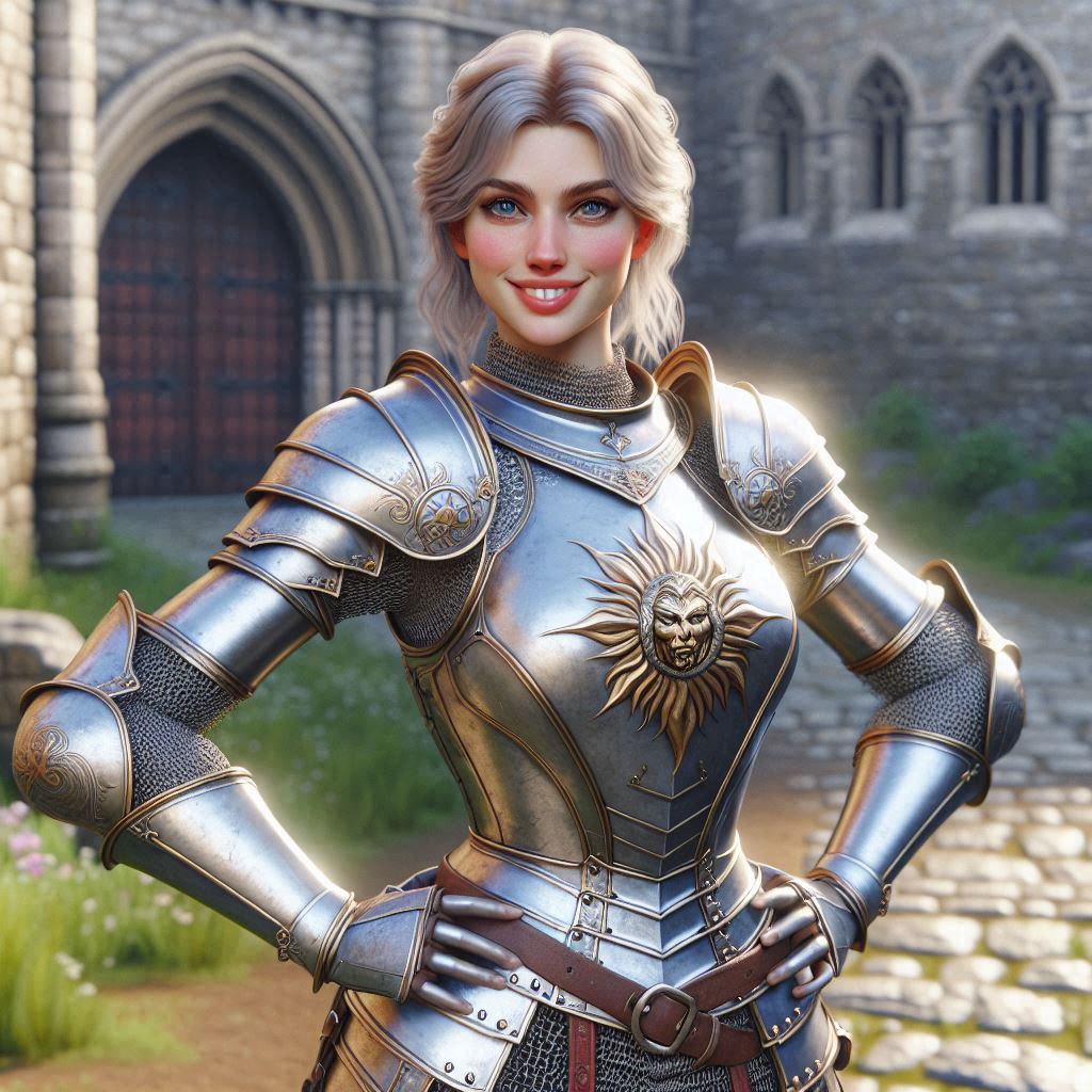 warrior woman (age 20, Slavic, fair skin, high cheekbones, short, cute, blue eyes, shoulder length pale blonde hair, wearing silver plate armor with gold sunburst motif) stands with hands on hips and smiles with raised eyebrow, Standing in a courtyard near a castle wall; realistic photo, medieval fantasy