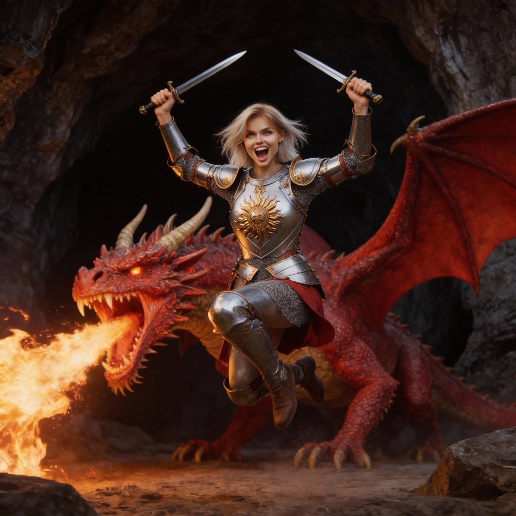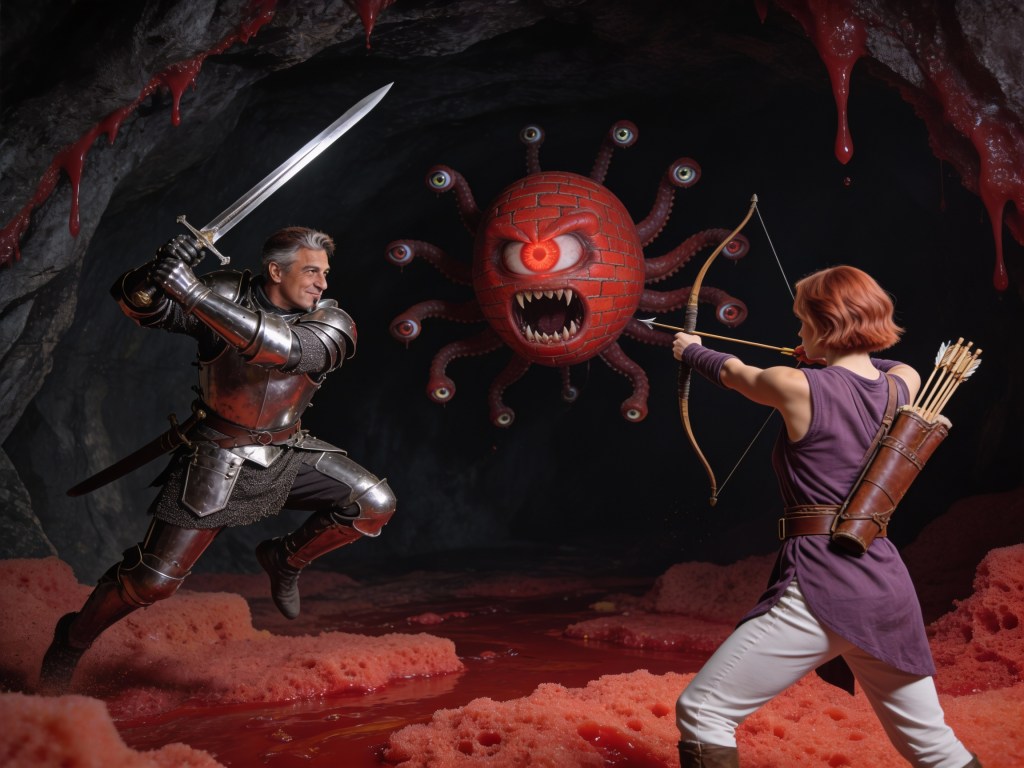 I find myself leaning more heavily on SeeDream. It is a little more involved sometimes, but by generating generic images of the characters (and a Beholder!) it can build complicated images much faster. It still falls down on action sequences. Look above, I think the Dragon and Gabby is much more exciting as an action render than the shadows or beholder.