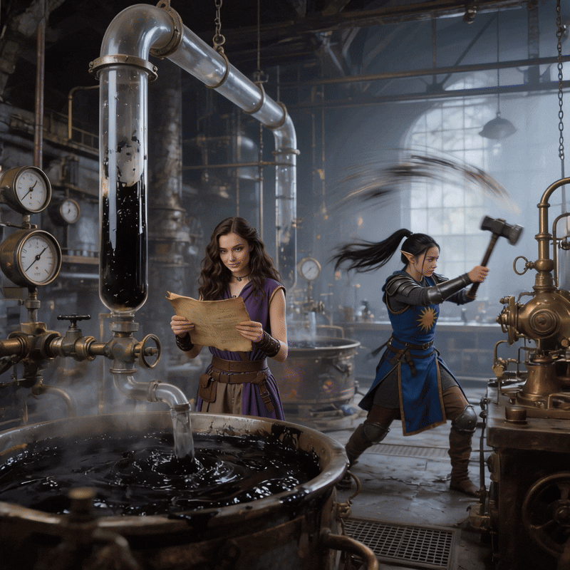 Then we found a lab of some sort. It had a few vats of bubbling goo, and pipes moving the stuff all about. Something was being brewed here and sent out to the river. Psyche immediately set to figuring out what was being done.