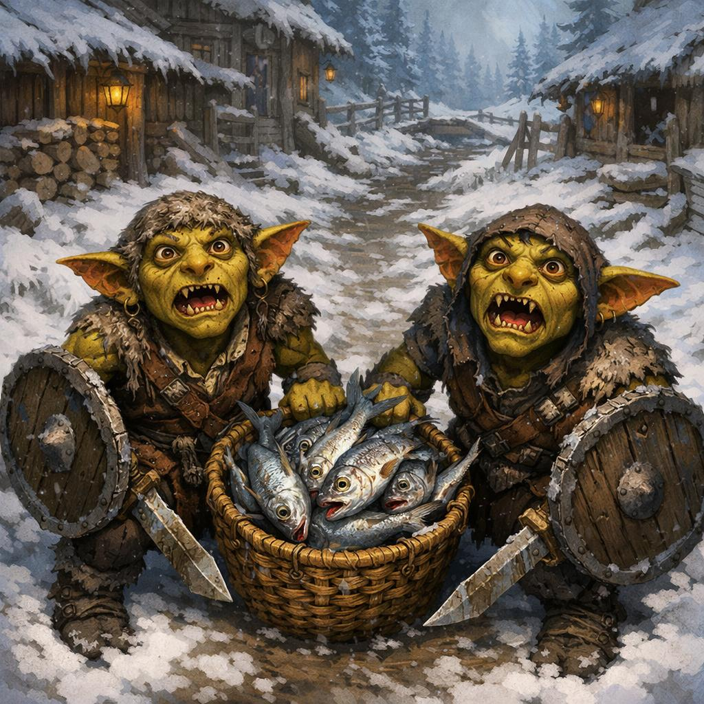 The best armor in town was scale mail, definitely not the quality of what we’d lost. But it was better than being unarmored. We headed over towards an inn, and saw a young boy in a panic over a basket of fish some goblins had stolen from him, we pointed towards, well we could see the goblins making off.