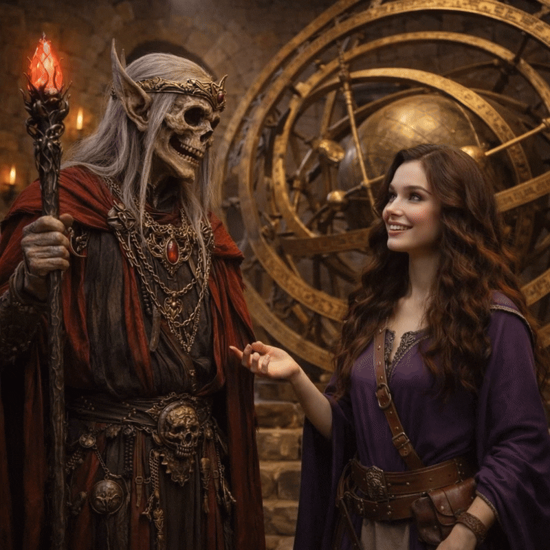 Atop the ruined tower was a giant astrolabe. Two figures moved about. One was dressed as a regal arch-mage. He was speaking non-sense, he had lost his mind.